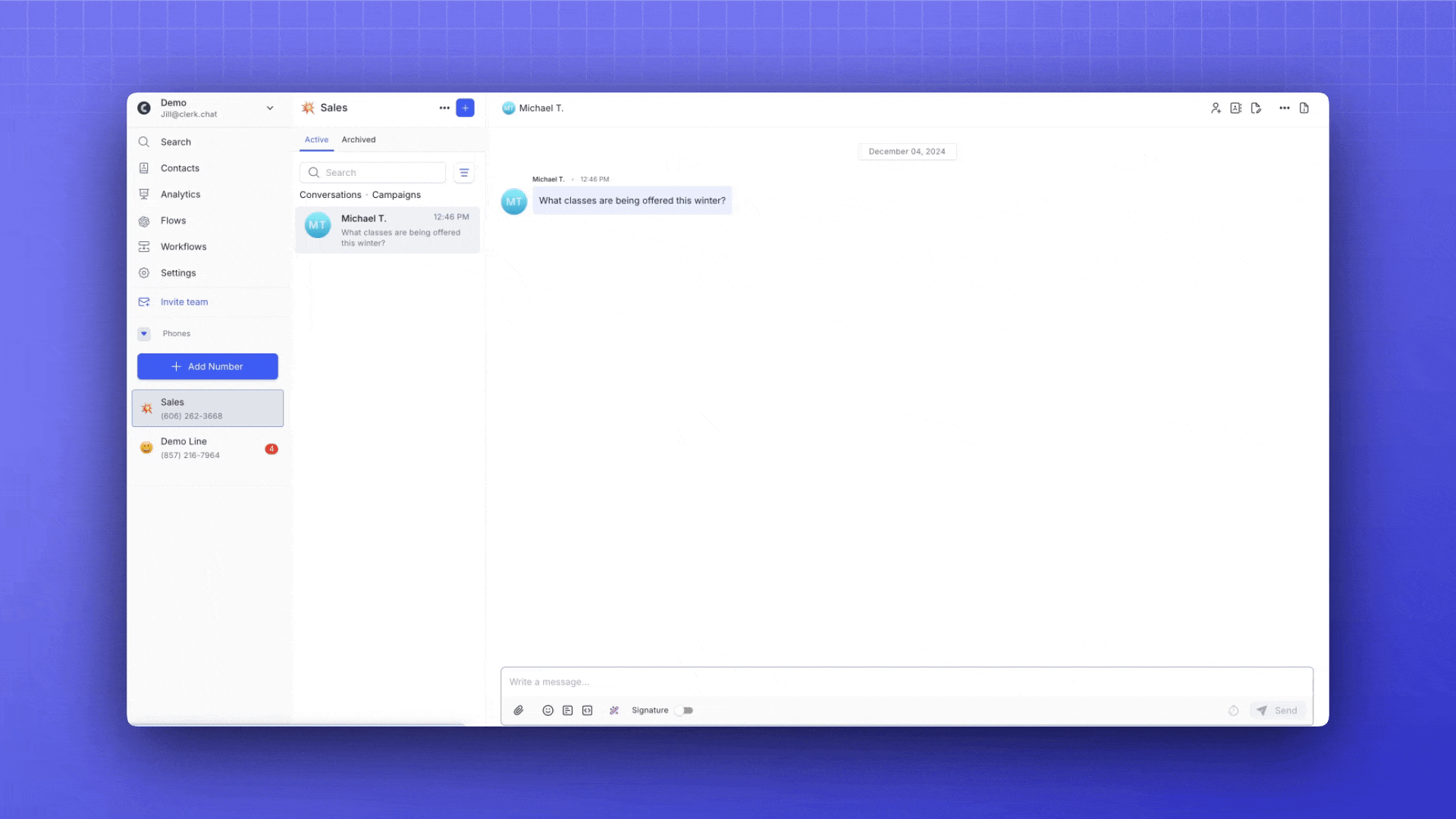 The conversation and campaign lists: Effortlessly browse and select conversations or campaigns.