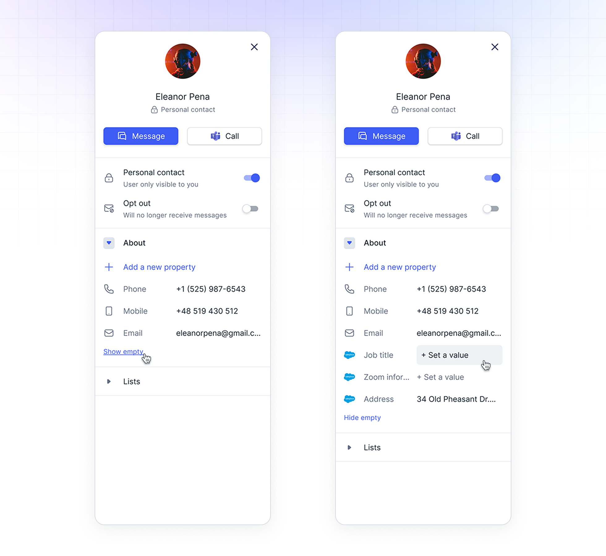 Hidden Empty Properties: Empty properties are now hidden by default, decluttering the contact card and improving readability. You can easily show or hide empty properties with a single click.